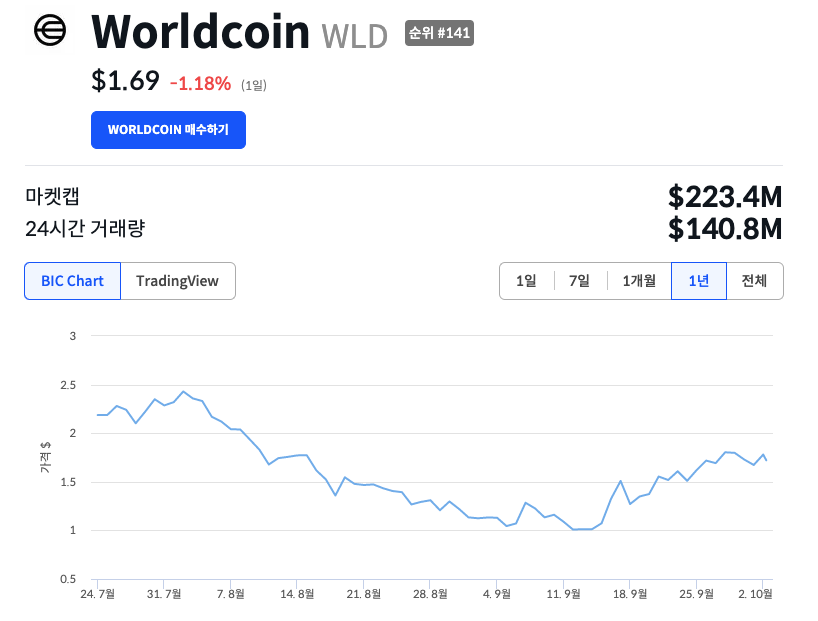 2일(현지시각) WLD는 전반적인 암호화폐 가격 상승에도 불구하고 전날 대비 1.18% 하락한 1.69달러에 거래됐다. 지난 8월 1일 최고가 2.43달러에 비해 30.4% 하락한 가격이다.