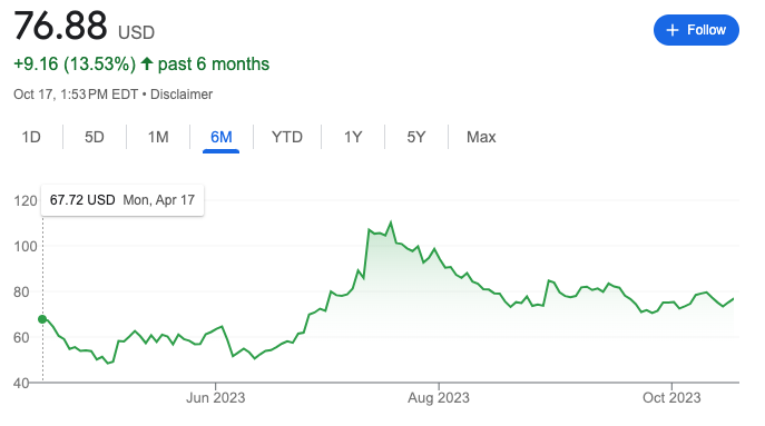 코인베이스 주가는 17일(현지시각) 전날 대비 3.3% 상승한 77.78달러를 기록했다. 지난 한 달 동안 주가는 4.7% 하락했지만, 지난 1년동안 131.4% 오른 수치다.
