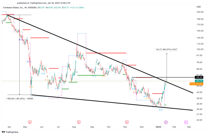 기술적 관점상 COIN은 4시간 차트에서 하락 쐐기형 패턴(falling wedge)을 돌파하고 있다.