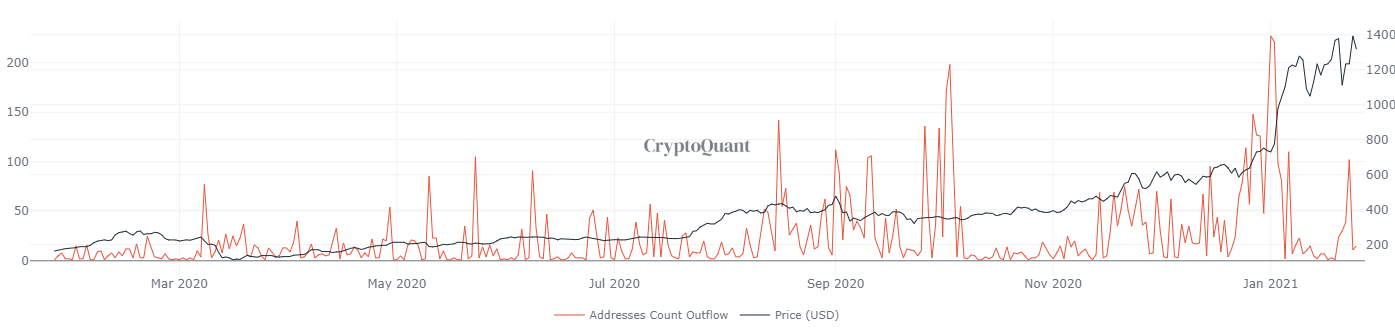 크립토퀀트(CryptoQuant)의 온체인 데이터를 살펴보면 코인베이스 지갑에서 거래된 이더리움의 주소가 지난 몇 달간 크게 증가했음을 알 수 있다. 가장 많은 거래량은 1월 1일로 기록되었다. 당시 이더리움 가격은 $729였다.