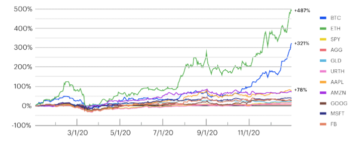 이더리움 지난해 487%라는 놀라운 상승률을 기록하면서 대부분 자산 상승률을 앞질렀다. 이후 이더리움 가격은 추가 상승해 거의 전고점의 두배에 달하는 가격을 기록했다. 이더리움은 작성일 기준 $1,315에 거래되고 있다.