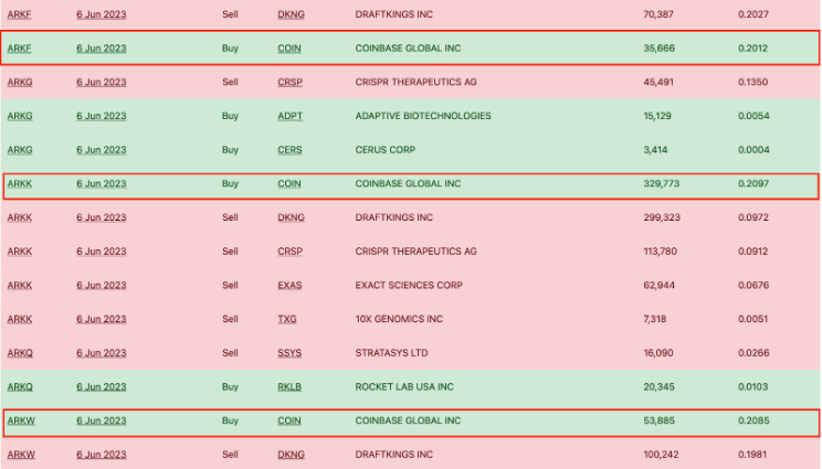 아크 인베스트먼트의 일일 거래표를 보면, 캐시우드는 지난 6일 세 번에 걸쳐 코인베이스 주식을 매입했다.