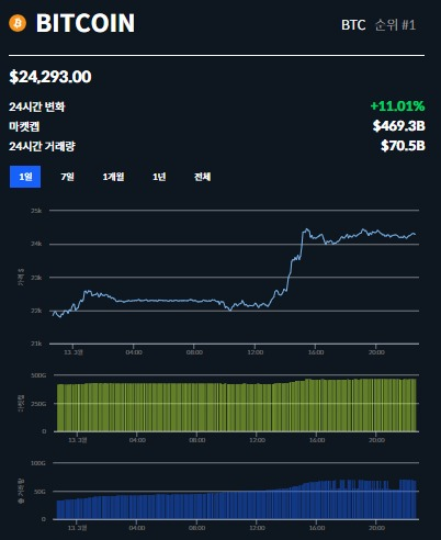 USDC와 함께 전반적인 암호화폐 시장도 저점에서 회복했다. 오전 7시30분 아침 기준 비트코인(BTC)은 지난 24시간 동안 11% 이상 상승해 2만4293달러에 거래됐다. 이번 달 최고가다. 코인글래스에 따르면, 시장이 놀라운 회복세를 보인 후 24시간 만에 3억551만달러 이상의 공매도가 청산됐다.