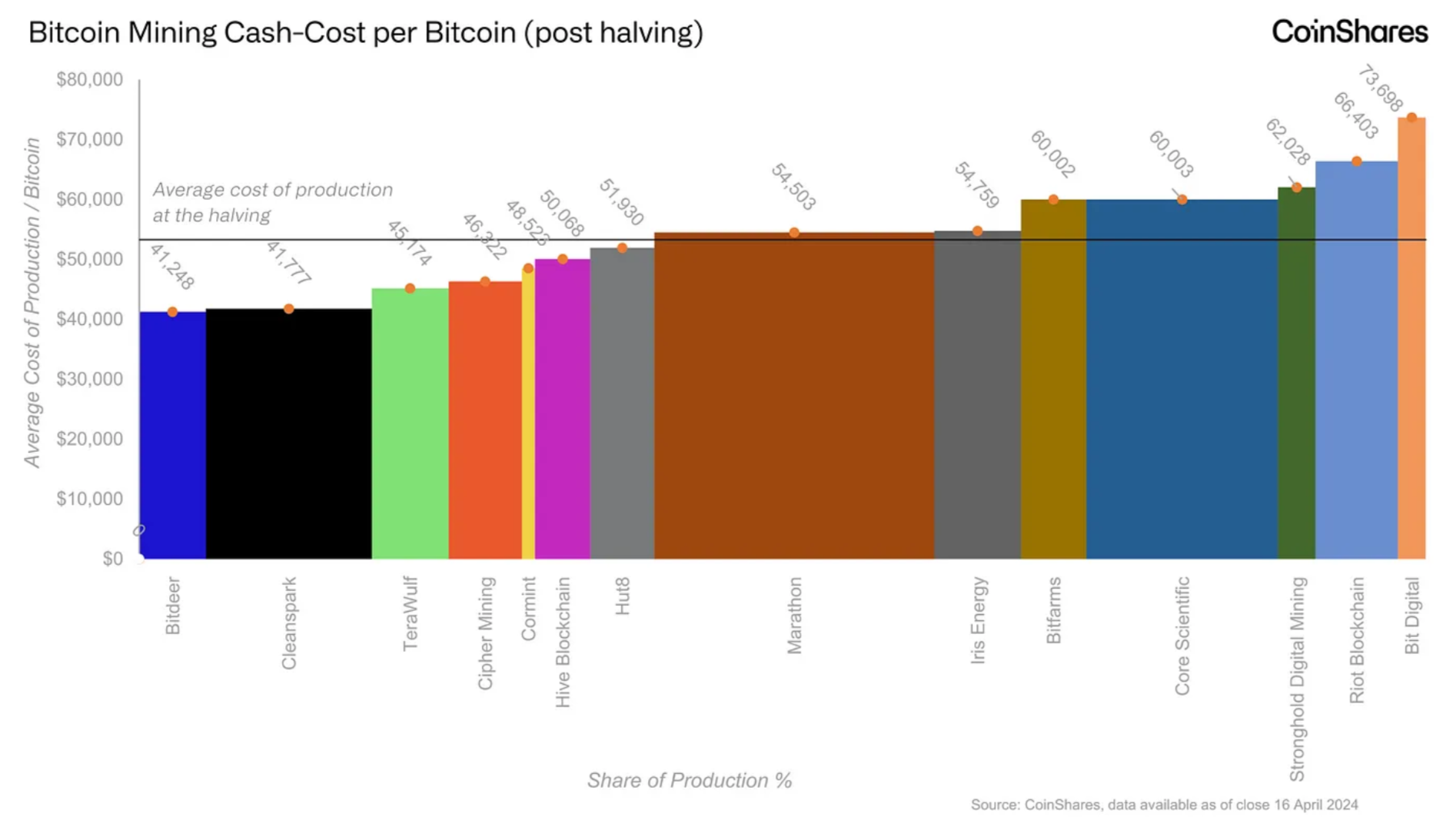 코인셰어즈는 “라이엇(Riot)과 헛8(Hut8)은 상당히 어려운 도전에 직면해 있다”며 “반면 비트디어, 콜민트(Cormint), 테라울프(TeraWulf), 아이렌(Iren) 등의 회사는 반감기에서 살아남을 수 있는 가장 좋은 위치를 점유했다”고 설명했습니다. 다만 비트팜스(Bitfarms), 비트디어, 라이엇 등은 2분기에 목표로 했던 해시율 증가율을 달성하지 못할 것으로 예상된다고 덧붙였습니다.
