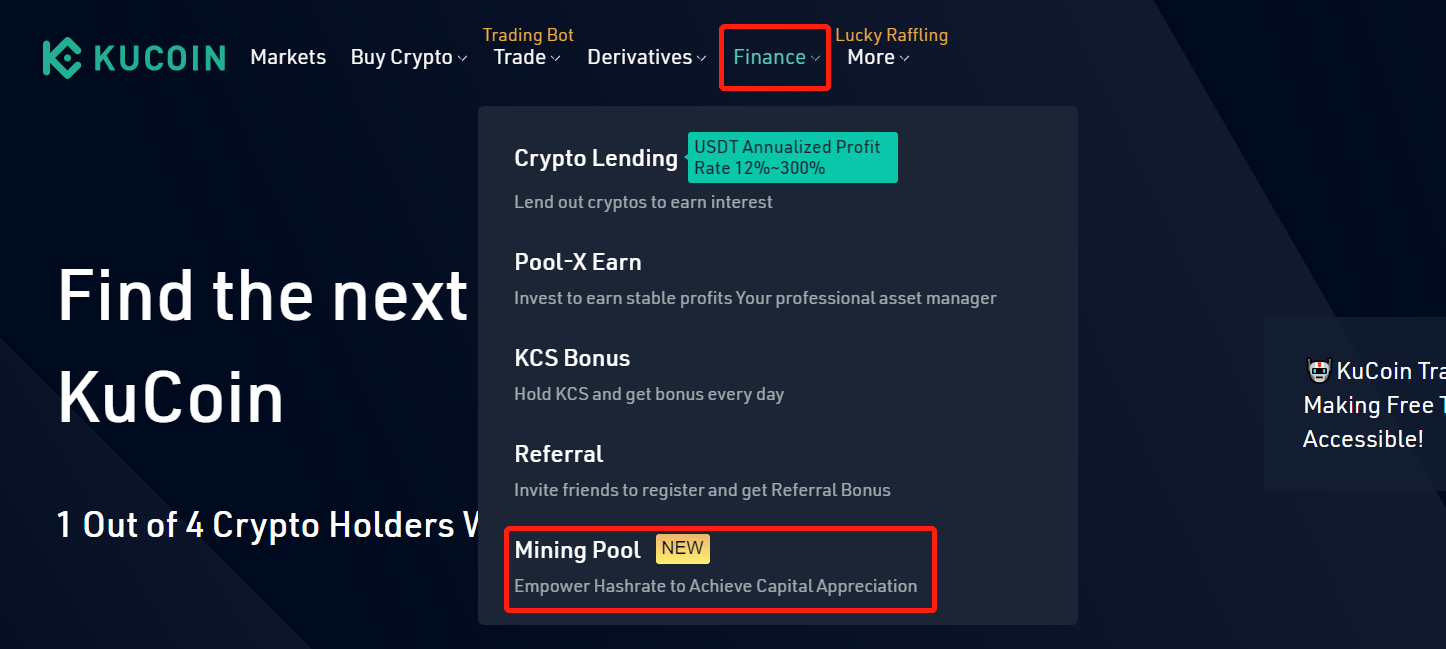 - 쿠코인 계정을 사용하여 쿠코인 풀의 공식 웹사이트에 로그인하거나 서치 바를 클릭하고 [Finance] – [Mining Pool]을 클릭하여 페이지로 이동