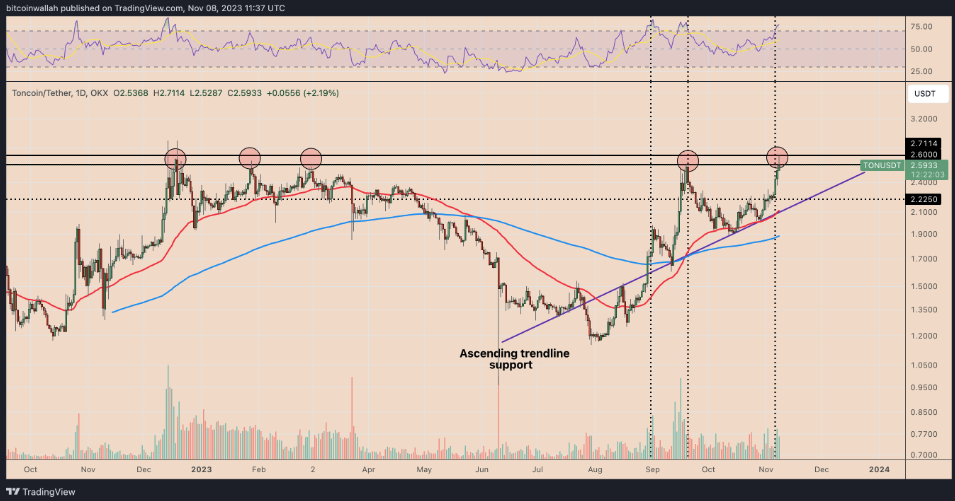 정반대 이야기: 다만, TON은 수개월 동안 이어진 저항선 2.6~2.7달러는 넘어서기 어려울 것으로 보입니다. TON은 지난해 12월부터 계속 이 구간 돌파를 시도했지만 항상 며칠이나 몇 주 뒤 가격 조정이 발생했습니다.