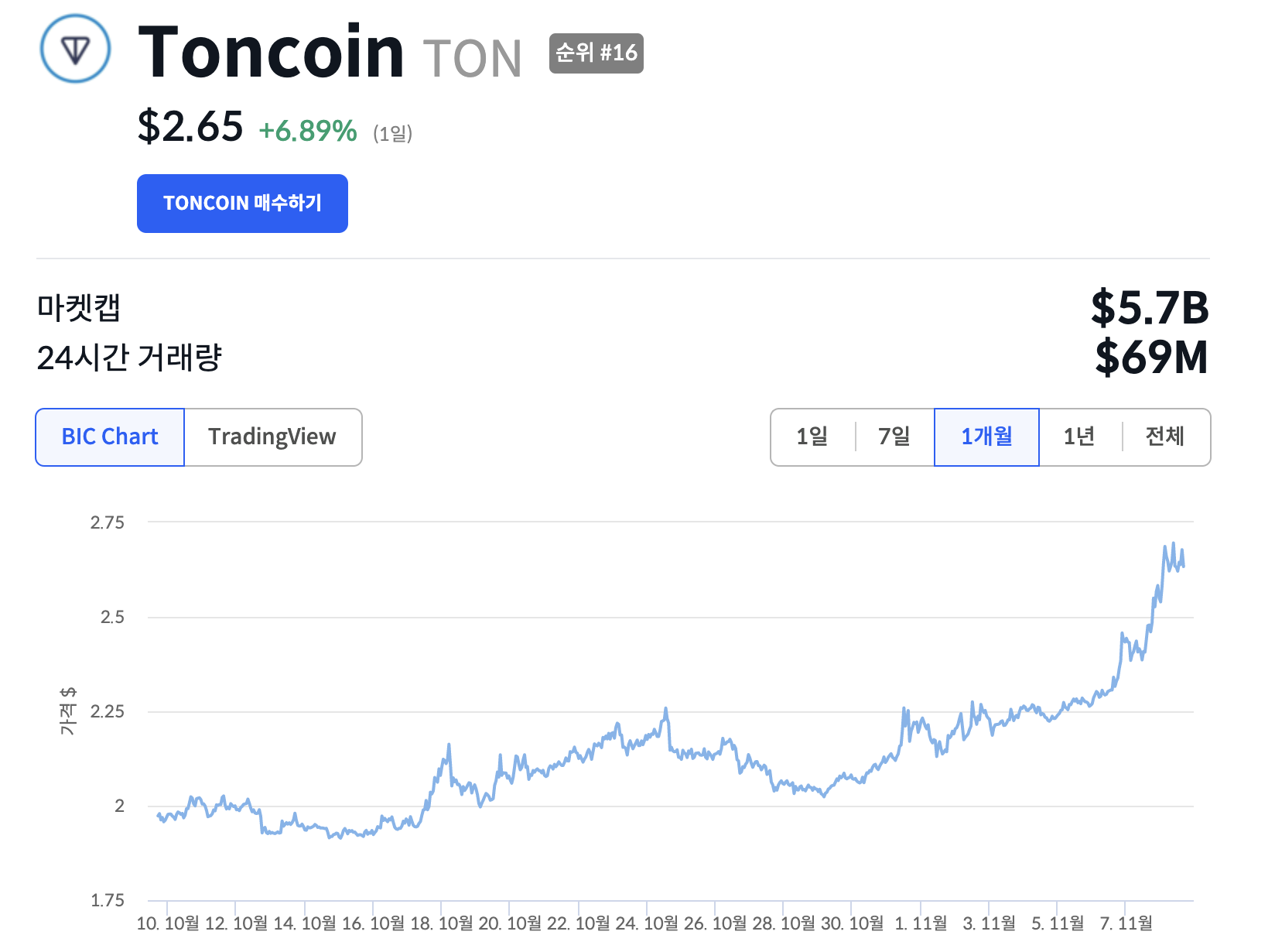 중요한 점은 두로프가 텔레그램 내 결제 수단으로 TON을 사용했다는 것입니다. 이 경품 이벤트가 시작한 후 TON 가격은 19.5% 상승했으며 거래량도 많이 증가했습니다. 9일 TON 가격은 최근 11개월 만에 최고 수준인 2.65달러를 기록했습니다. 전날 대비해서는 6.89%나 급등했습니다.
