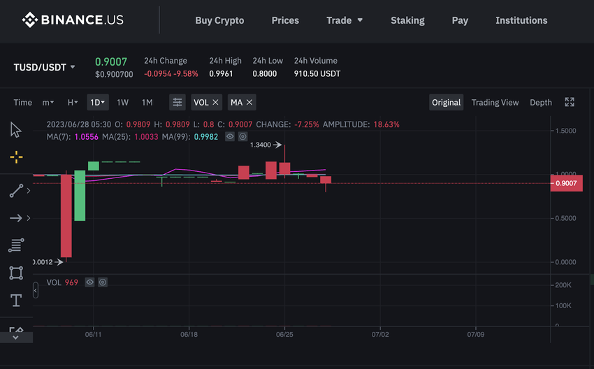 스테이블코인 트루USD(TUSD)에 또다시 디페깅 현상이 발생했다. TUSD-USDT 거래쌍은 바이낸스US와 바이낸스에서 각각 0.9007달러, 0.9984달러에 거래되고 있다.