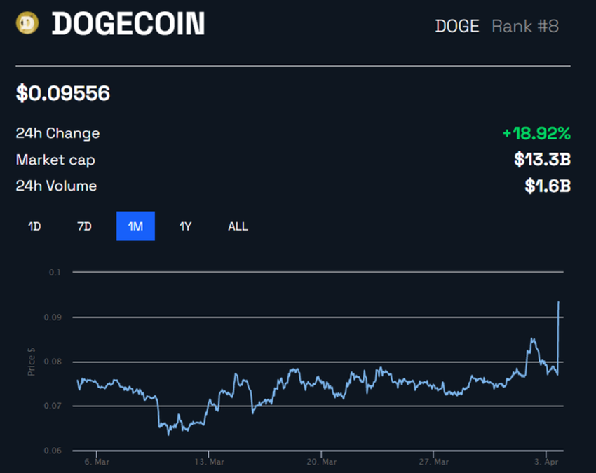 트위터 로고가 시바견의 머리와 몸통을 형상화한 도지코인(Dogecoin) 엠블럼으로 바뀌면서 토큰 가격이 20% 넘게 급등했다.
