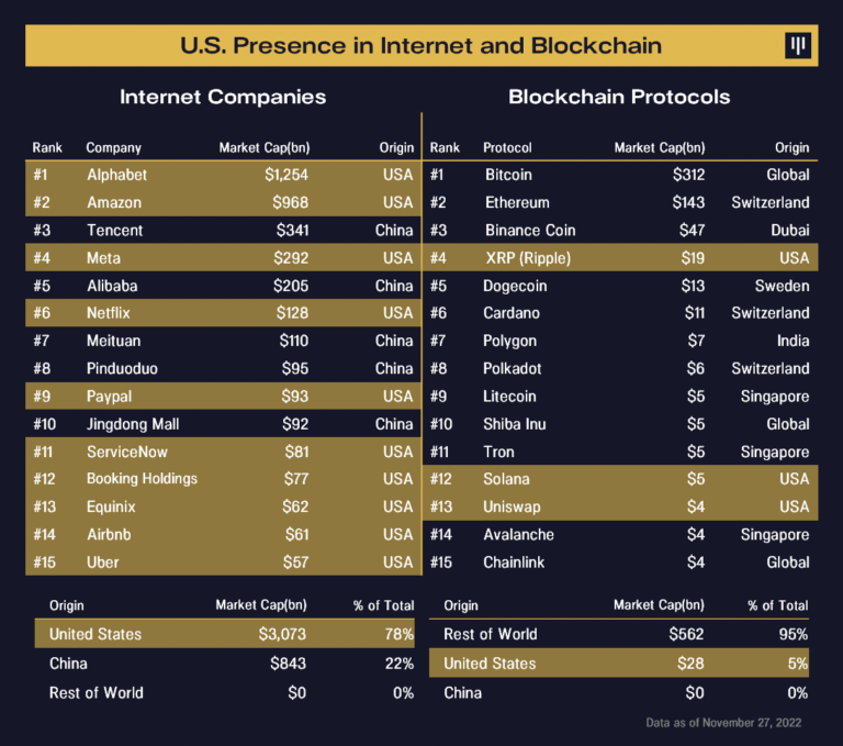 모어헤드는 미국이 보다 현명한 규제를 펼칠 필요가 있다면서 인터넷 시대와 블록체인 시대를 비교했다. 인터넷 시대 초창기 미국 정부는 인터넷 기업들에게 세금과 규제 측면에서 전폭적인 지원을 아끼지 않았고, 그 결과 오늘날 세계 최대의 인터넷 기업들은 미국 기업이 아니면 중국의 ‘짝퉁’ 기업이라는 것이다. 세계 상위 인터넷 기업 15개사 가운데, 미국 기업들의 시가총액을 합하면 78%에 이르며, 나머지는 중국 기업들이다. 그러나 블록체인 시대는 정반대 경향을 보인다. 전체 블록체인 거래의 95%가 미국 국외에서 이뤄지기 때문이다.