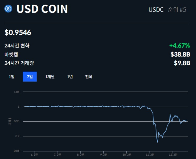 비인크립토 데이터를 보면, 서클의 약속이 나오자 USDC는 1달러를 거의 회복했다. 하지만 보도시각 현재 0.95달러로 되돌아갔다. USDC는 3월 11일 투자자들의 폭락 우려 속에 60억달러 어치 이상이 빠져나갔다.