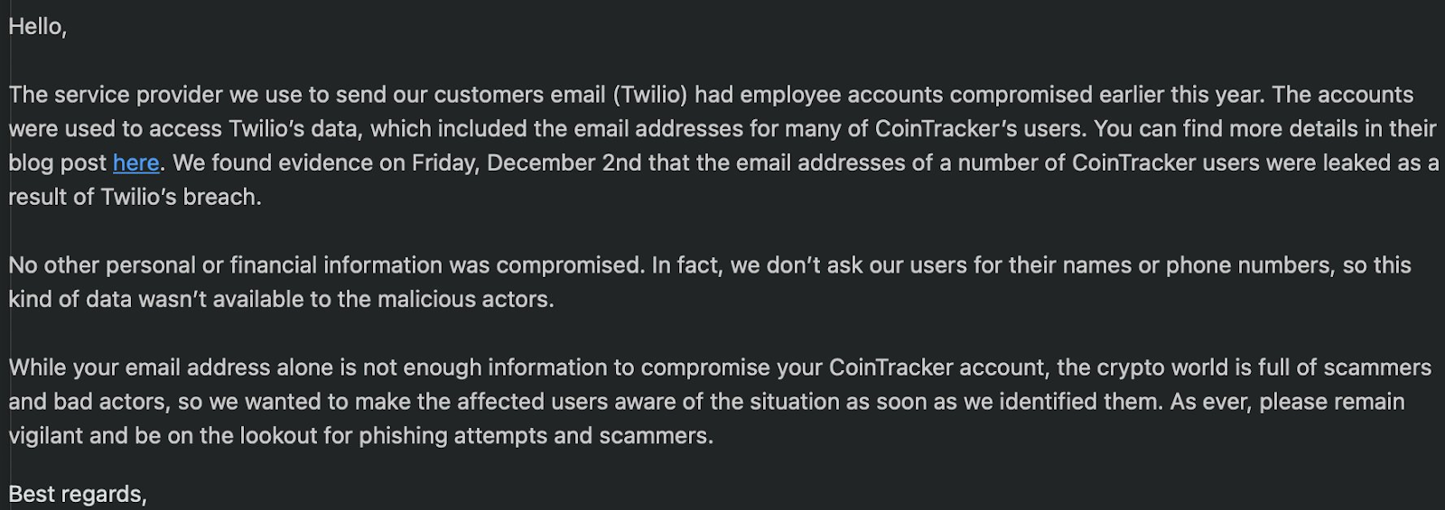 트위터 사용자는 이메일을 통해 코인트래커가 타사 서비스인 트윌리오(Twilio)가 손상되었음을 확인했으며, 이로 인해 해커들이 코인트래커 사용자들에게 접근할 수 있었다고 보고했다.