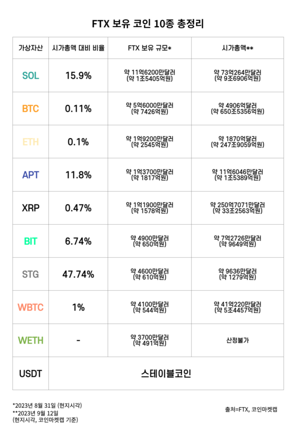 분석 결과, STG(스타게이트파이낸스), SOL(솔라나), APT(앱토스)는 9월 12일 현재 시가총액 대비 FTX 보유 물량 비율이 10% 이상인 것으로 나타났다.