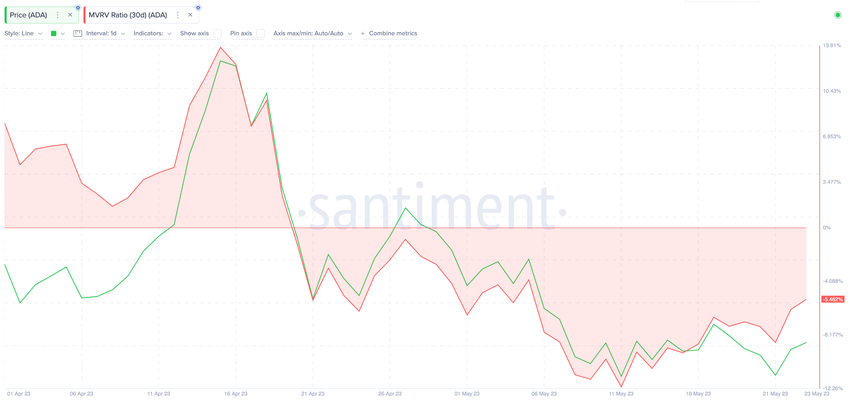 ADA 가격 상승에도 불구하고 시장가치 대비 실현가치(MVRV) 지표에 따르면 대부분 투자자는 여전히 상당한 손실을 보고 있다. MVRV 비율은 투자자의 구매 가격을 자산의 현재 시장 가치와 비교해 투자자의 순 재무 상태를 평가한다.