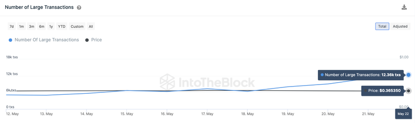 대량 거래는 일일 거래 규모가 10만달러를 초과하는 거래를 의미한다. 카르다노 고래 활동이 이 정도 규모를 기록한 건 2021년 5월이 마지막이었다.