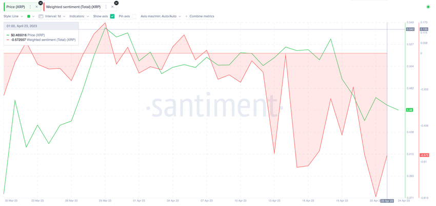 2023년 4월 현재 XRP 가격 vs. 가중 감정. 출처: Santiment