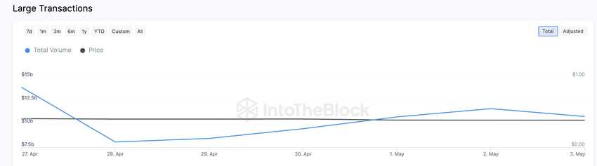 대량 거래는 특정 날짜 10만달러를 초과하는 거래를 합산한 재무 지표다. 이 수치가 증가하면 고래 투자자가 기초 자산에 대한 베팅을 늘리고 있다는 신호다.