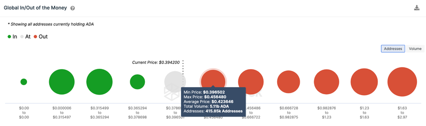 아래의 글로벌 인/아웃 오브 더 머니 어라운드 프라이스 데이터에서 예측한 바와 같이, 데이터 기반 ADA 가격 예측에 따르면 0.45달러까지 상승할 가능성이 있는 것으로 나타났다.