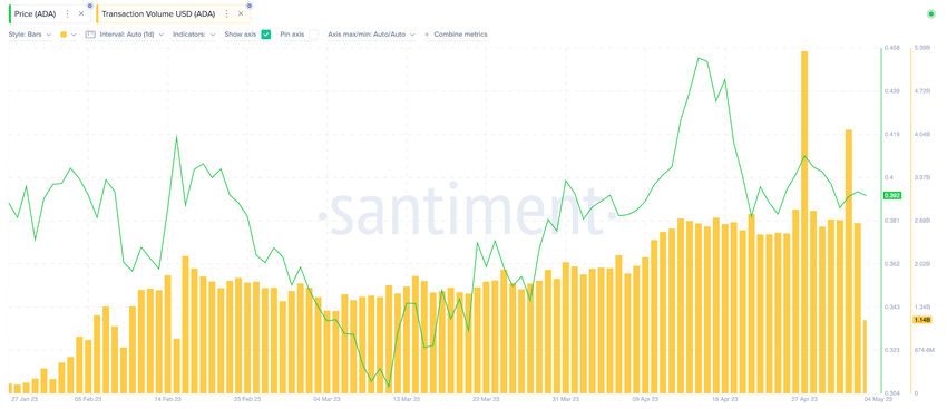 카르다노의 온체인 데이터는 4월 10일 이후 거래량이 지속적으로 20억 달러 이상을 유지하고 있음을 보여준다.