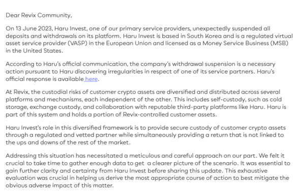 가상자산 투자·저축 플랫폼 레빅스(Revix)는 6월 28일(현지시각) “파트너 수탁사 하루가 입출금을 중단하면서 리빅스가 보유한 가상자산 중 24%를 동결 처리하기로 했다”고 밝혔다.