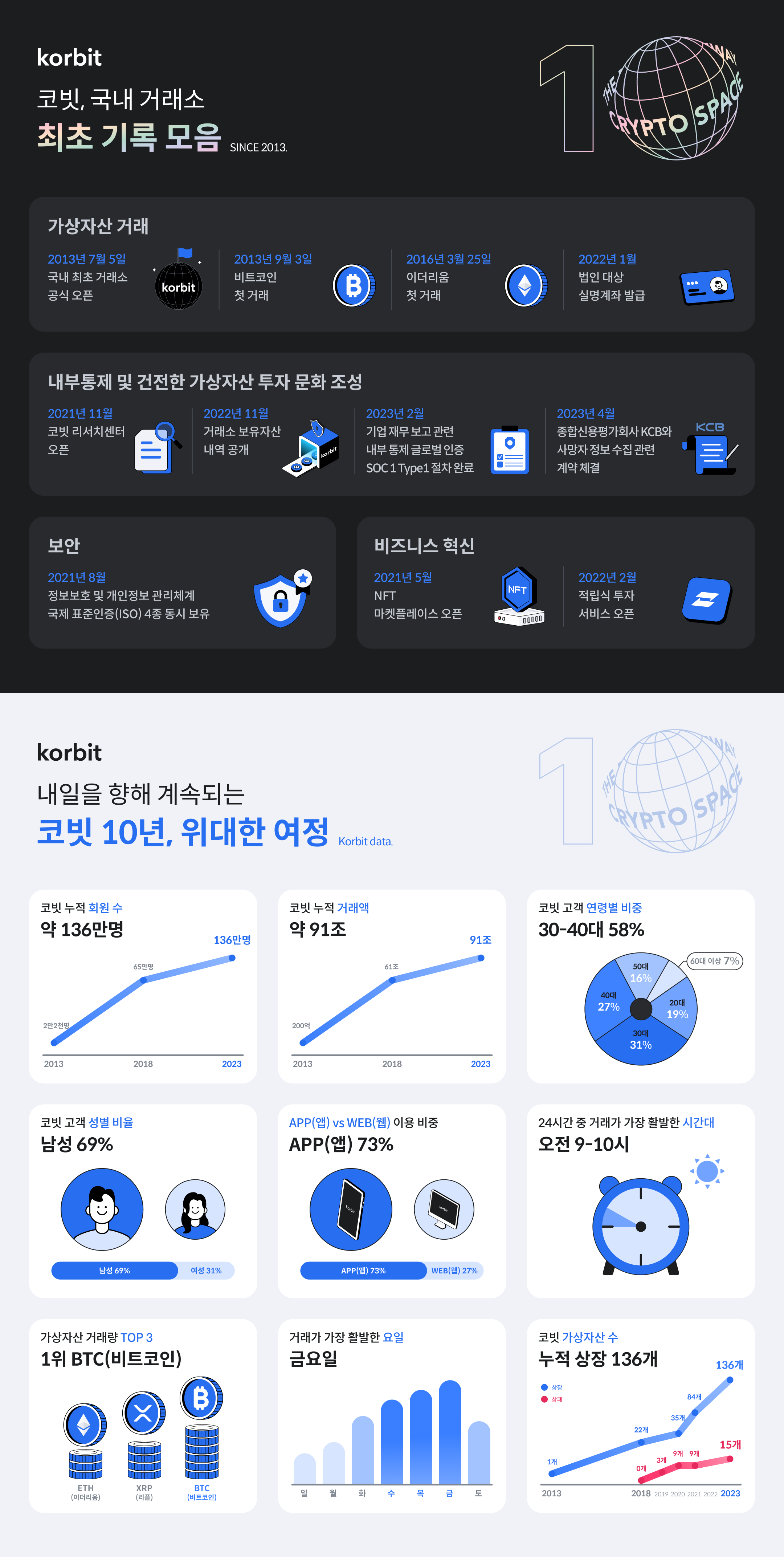 한편 코빗은 지난 10년 간의 주요 데이터(2023년 6월 15일 기준)도 공개했다. 2013년 말 당시 2만 2천 명이던 코빗 누적 회원 수는 현재 136만 명이다. 창립 첫 해 200억 원이었던 누적 거래액은 91조 7천억 원으로 늘었다. 성별 고객 비중은 남성(69%)이 여성(31%)보다 두 배 이상 많았다. 연령별 고객 분포에서는 30대(31%)가 가장 많았고 40대(27%)와 20대(19%)가 뒤를 이었다.