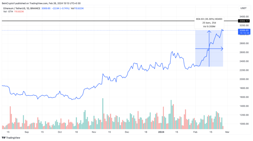 이러한 전략적 움직임의 영향은 이더리움의 가격 추이에서 명확하게 확인할 수 있습니다. 지난 한 달 동안 이더리움의 가치는 35% 가까이 상승하며 괄목할 만한 상승세를 보였습니다. 이러한 급등으로 인해 이더리움 가격은 2022년 4월 이후 최고치인 3,100달러까지 올랐습니다. 시장 정보 회사인 디센트레이더는 이러한 추세를 면밀히 모니터링하고 있습니다. 이들은 시장 상승세가 새로운 저항선인 3,300달러를 목표로 삼을 것을 제안합니다.