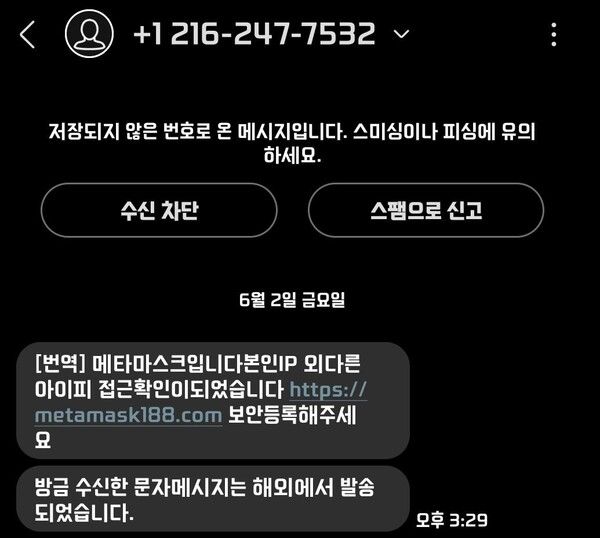 6월 2일 <디지털애셋> 취재를 종합하면, 이날 오후 3시경 메타마스크라고 설명하며 “본인 IP 외 다른 아이피 접근 확인이 되었습니다”라는 내용의 피싱 의심 문자가 돌고 있다.