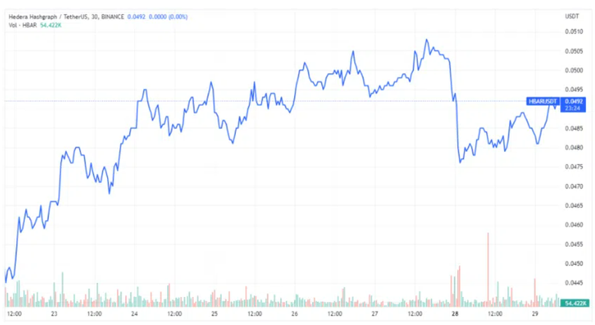 기본 HBAR 자산의 가격은 지난 7일 동안 상당히 눈에 띄게 상승했다. 지난 주에 0.044달러에서 시작했지만 11% 증가한 0.0495달러까지 상승했다.