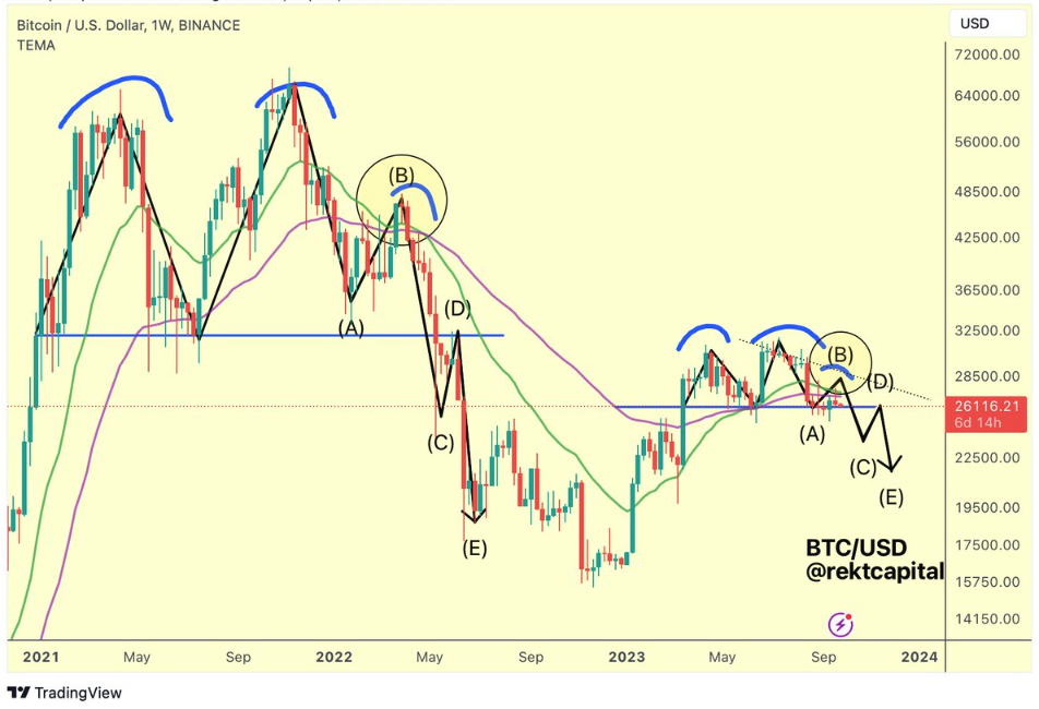온체인 데이터 플랫폼 웨일맵(Whalemap)의 애널리스트 바로버추얼은 같은 날 엑스(옛 트위터)에 “비트코인이 지역 저항선을 돌파하는 데 실패했다”며 “약간의 약세장이 이어질 것으로 보인다”고 말했다. 또, 바로버추얼은 “가격이 헤드 앤 숄더 패턴을 나타내고 있다”며 “비트코인이 2만 2000달러에서 2만 달러 범위로 떨어질 위험이 있다”고 경고했다.