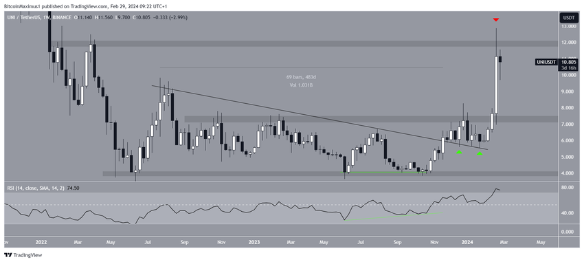 몇 번의 재테스트 끝에 2024년 초에 UNI 가격은 다시 상승하기 시작했고, 수평 저항 구간을 돌파했습니다. 상승세는 지난주 12.86달러로 최고점을 찍으며 절정에 달했습니다. 이후 UNI는 소폭 하락했습니다.