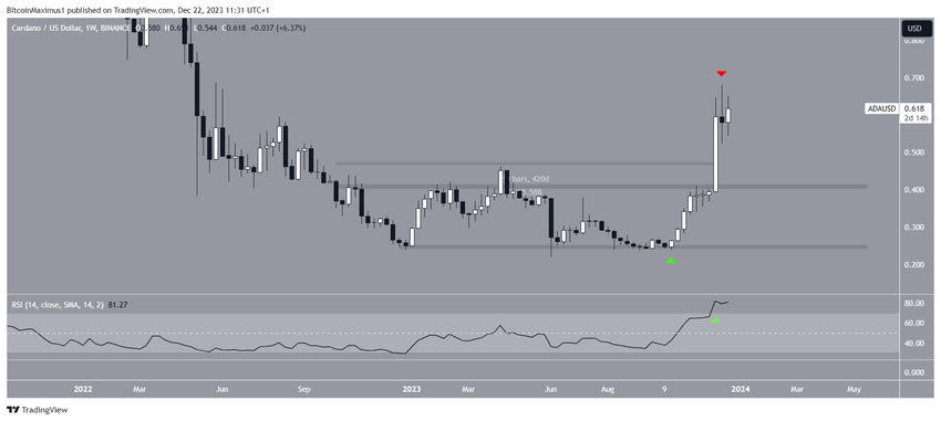 가격이 상승하는 동안 420일 동안 유지되던 장기 수평 저항 구간을 돌파했습니다. 이로 인해 12월 14일에 ADA는 0.68달러로 연중 최고치를 경신했습니다.