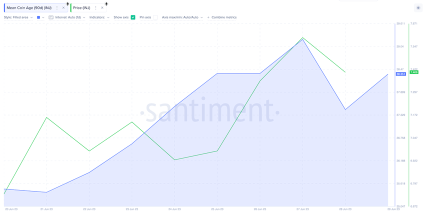 샌티먼트 데이터에 따르면, INJ 장기 보유자들이 자신감을 회복했음을 알 수 있다. 아래에서 나타나듯, 평균 코인 연령(Mean Coin Age)은 블랙록의 ETF 신청 닷새 뒤인 6월20일부터 상승세를 나타내고 있다. 이 수치가 큰 폭으로 상승했다는 건 인젝티브 네트워크 전반에 축적이 이뤄지고 있음을 의미한다. 지금 추세가 계속된다면, INJ 가격은 당분간 계속해서 상승할 가능성이 크다.