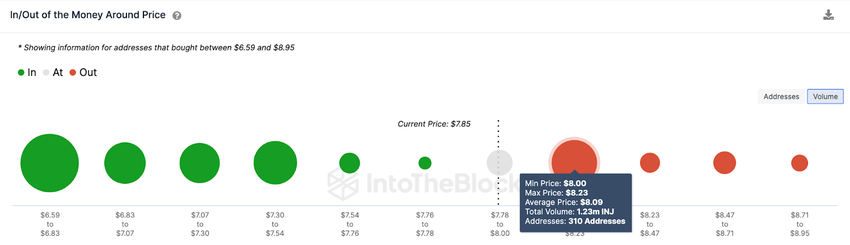 앞서 언급한 상승 요인을 감안하면 10달러 돌파는 무난할 것으로 예상된다. 그러나 이를 위해서는 먼저 8달러 매도벽을 뚫어야 한다. 이 구간에서 123만개 INJ를 매수한 310명의 투자자가 매도하면 가격이 하락할 수 있다.