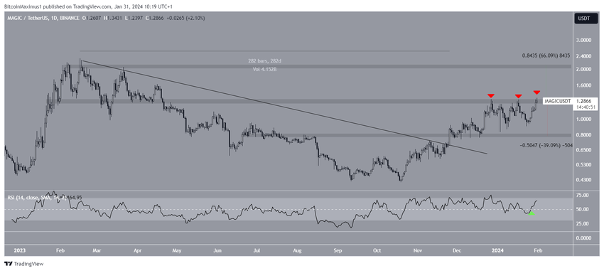 MAGIC 가격은 2023년 10월 19일 최저 $0.41까지 하락한 이후 상승했습니다. 상승세로 인해 11월 25일 하강 저항 추세선을 돌파했습니다.