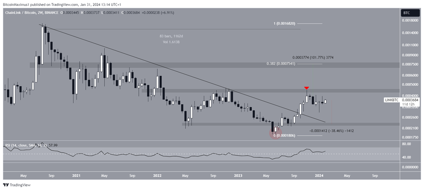 LINK 가격은 1,100일 만에 추세선을 이탈하여 11월에 0.00045파운드의 최고치를 기록한 후 하락했습니다. 이어진 하락으로 ₿0.00042 영역이 저항선으로 확인되었습니다.