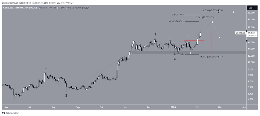 가장 가능성이 높은 카운트는 LINK가 상승 움직임의 다섯 번째이자 마지막 파동(검은색)에 있음을 나타냅니다. 하위 파동 수는 흰색으로 표시되며, 이는 가격이 하위 파동 3에 있음을 나타냅니다.