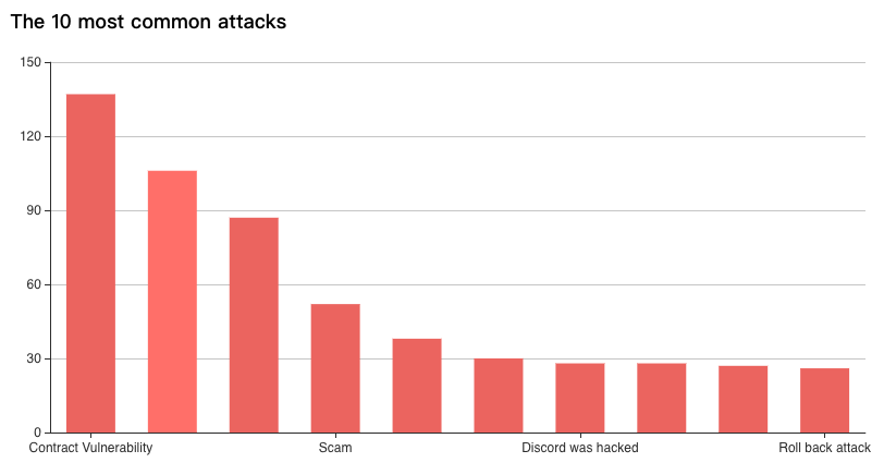 가장 많은 범죄 수법으로는 스마트 컨트랙트의 취약성을 노린 해킹과, 개발자가 투자금을 받고 갑자기 프로젝트를 중단하는 ‘러그풀’, 이용자가 담보를 잡지 않고도 대출을 받을 수 있는 ‘플래시 대출’을 대상으로 한 공격, 사기, 암호화폐 개인 키 유출 등이었다.
