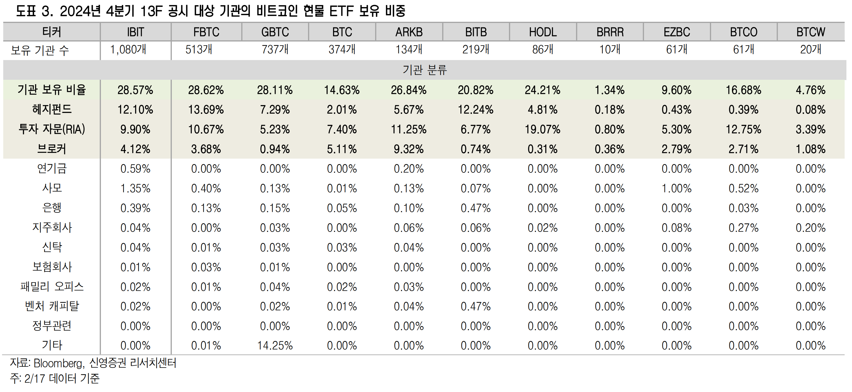 신영증권은 19일 2024년 4분기 미 증권거래위원회(SEC)에 제출된 13F 공시를 분석해 비트코인 현물 ETF를 보유한 기관의 수가 전 분기보다 37% 증가한 1576개에 이른 것으로 집계됐다고 밝혔습니다.