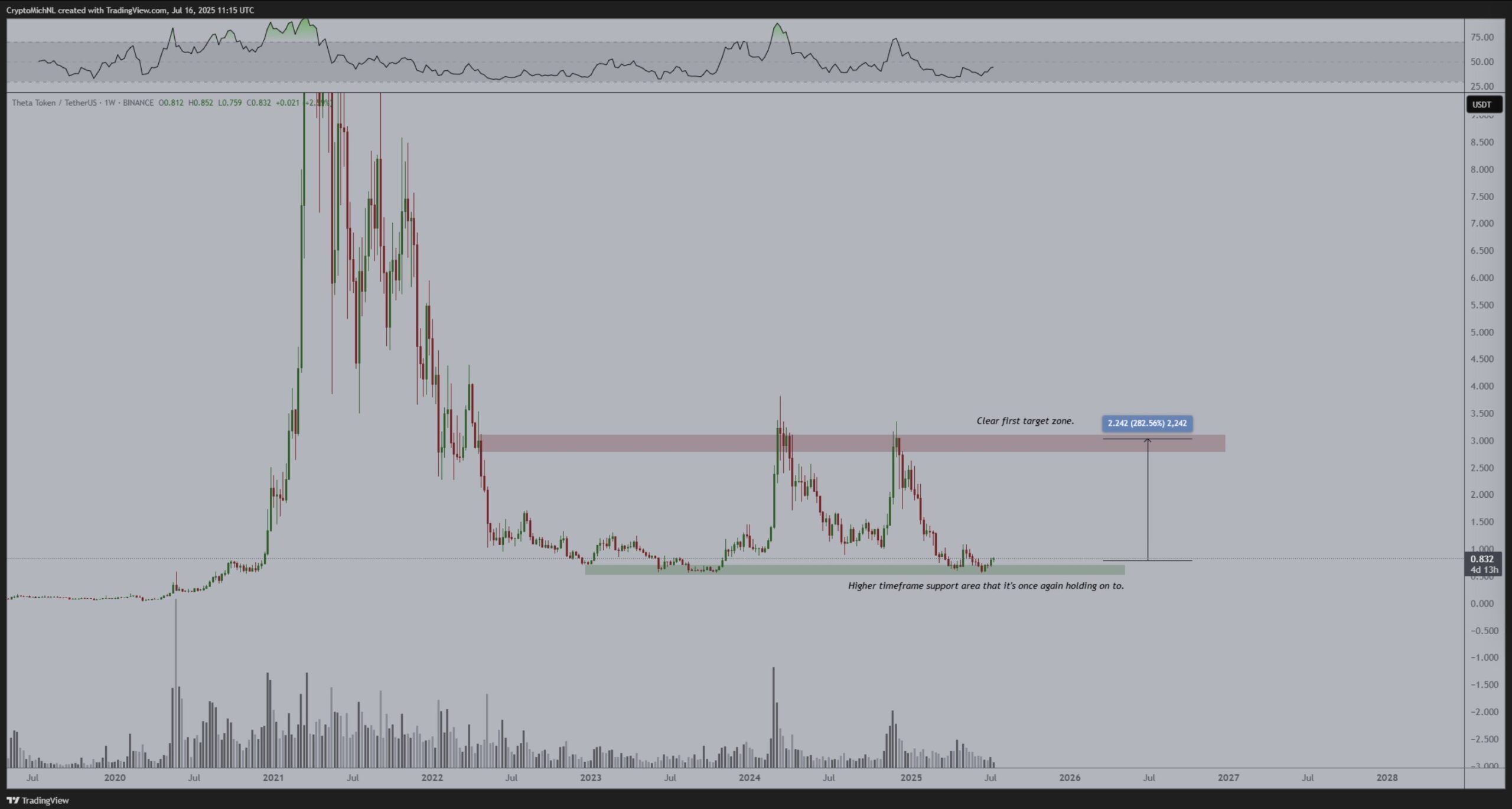 그는 THETA가 장기 차트에서 축적 구역에 있다고 언급했습니다. 긍정적인 추세가 계속된다면, 그는 토큰이 최대 280% 상승할 수 있다고 예측합니다. 이는 투자자에게 상당한 이익입니다.