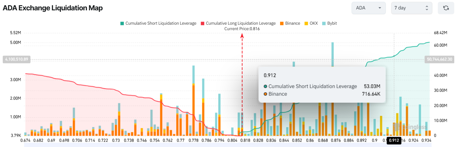 카르다노(ADA)의 7일 청산 히트맵은 ADA가 0.90달러를 초과하면 숏 포지션 청산이 5000만 달러를 초과할 수 있음을 시사합니다. 이는 현재 가격인 0.81달러에서 10% 증가한 것입니다.