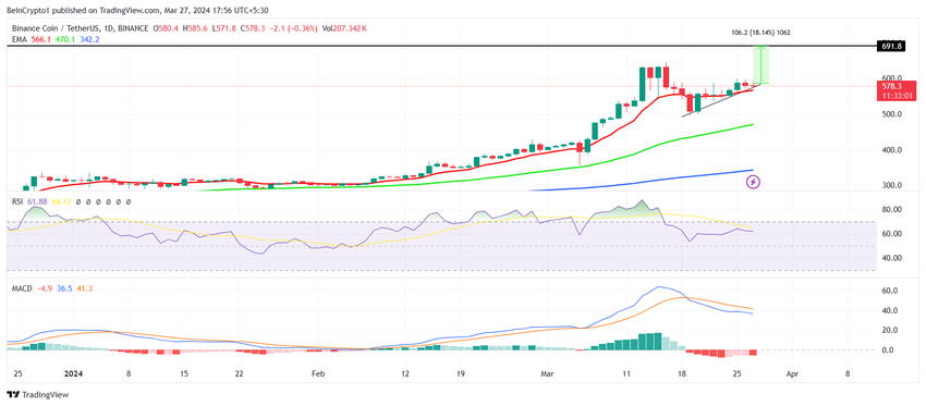 MACD와 RSI는 모두 현재 하락세를 보이고 있지만, 약세 추세를 보여주고 있지는 않습니다. BNB가 50일 지수이동평균(EMA) 위에 머무는 한, 코인은 회복할 기회를 가질 것이며, 이는 4월에 이루어질 가능성이 높습니다.