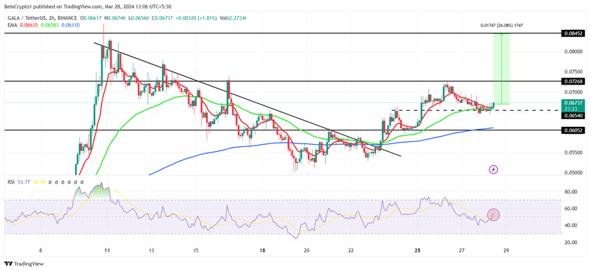 이는 GALA가 랠리를 이어갈 가능성이 있음을 의미하며, 이는 $0.084를 기록할 것입니다.