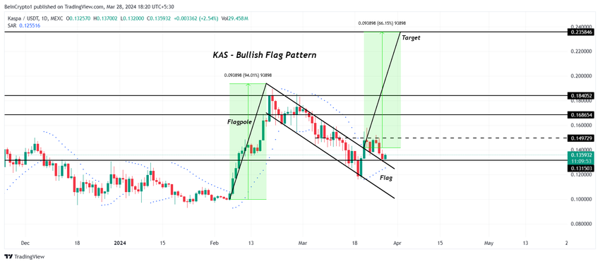 이 패턴에 따르면 KAS는 66% 성장률을 보일 것으로 예상되며 목표 가격은 0.235달러입니다. 따라서 카스파는 주목해야 할 코인입니다.