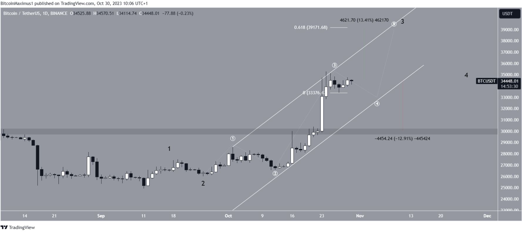 • 그러나 비트코인 가격 일봉이 3만3000달러 아래에서 마감되면 하락이 시작될 수 있다.