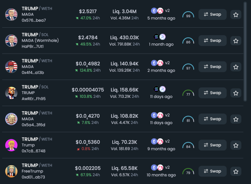 암호화폐 시장은 이더리움이나 솔라나 같은 블록체인에서 트럼프 테마 토큰이 등장하면서 상당한 변동성을 보였습니다. 실제로 이 토큰들은 단 24시간 만에 최대 124%의 상승률을 기록했습니다. 이러한 전례 없는 급등은 이러한 자산에 대한 메커니즘 캐피털의 낙관적인 입장 때문인 것으로 보입니다.