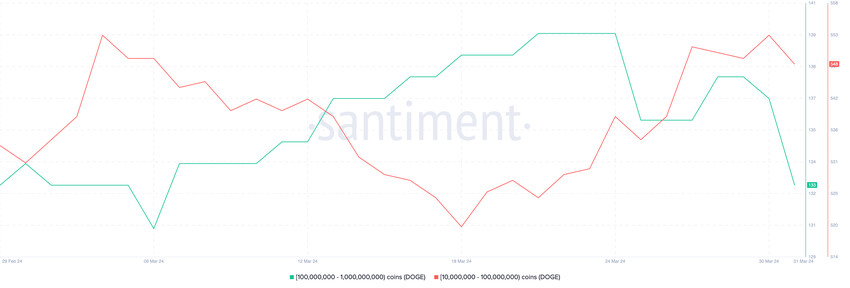 3월 18일부터 3월 30일까지 520명에서 553명으로 증가했던 1000만~1억 도지 보유자는 하루 만에 553명에서 548명으로 감소했습니다. 1억~10억 DOGE 보유자는 지난 하루 동안 137명에서 133명으로 감소했습니다. 3월 24일에는 140명으로 최고치를 기록했습니다.