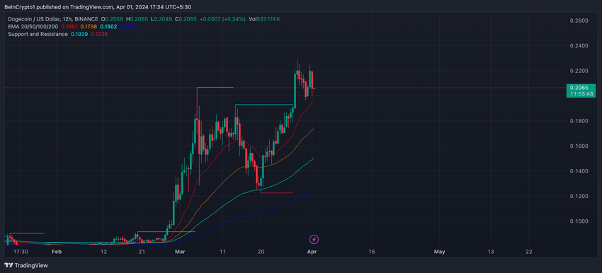 모든 단기 선이 장기 선 위에 위치하여 상승 모멘텀을 나타내는 지수이동평균(EMA) 선이 현재 강세 신호를 나타내고 있는DOGE 가격 차트는 상승세를 보이고 있습니다. 그러나 ADX(평균 방향성 지수) 및 SAR(정지 및 반전)과 같은 다른 주요 지표가 곧 이 추세의 반전 가능성을 암시하기 때문에 EMA 선에서 보이는 이러한 낙관적인 추세는 도전에 직면할 수 있습니다.