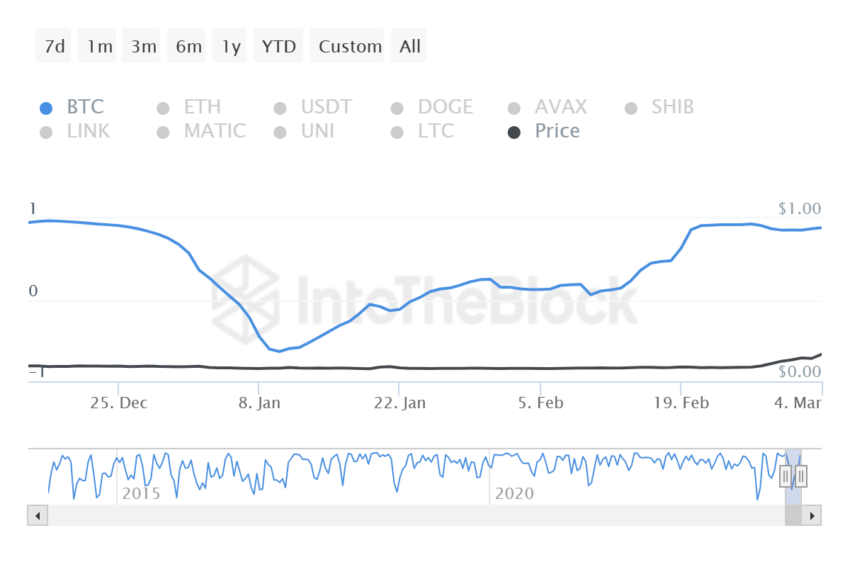 지난 24시간 동안 비트코인 가격은 상당히 하락했으며, 도지코인 가격도 같은 추세를 따랐습니다. 도지코인은 비트코인과의 상관관계가 0.89로 높기 때문에 직접적인 영향을 받았습니다.