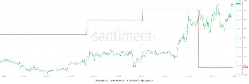 지난 며칠 동안 AVAX의 7일 상대강도지수(RSI)가 75에서 69로 하락하며 눈에 띄게 하락했습니다. 이러한 하락에도 불구하고 가격은 일주일 만에 40달러에서 61달러로 놀랍게도 급등했습니다.