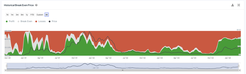 수익성 있는 보유자의 75%와 비슷한 급등은 2021년에 마지막으로 목격되었습니다. 이 급등 이후 AVAX 가격은 불과 20일 만에 75달러에서 117달러로 크게 상승했습니다. 이러한 역사적 맥락은 지표로서 역사적 손익분기점 가격의 중요성을 잘 보여줍니다.